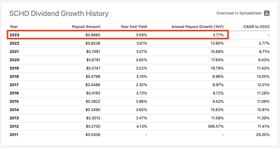 현재 SCHD의 배당수익률(시가배당률)은 약 3.5% 정도이며 SCHD의 배당성장률은 10% 내외입니다.
